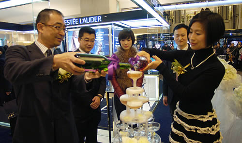 雙方領(lǐng)導(dǎo)共同為慶祝雅詩蘭黛盛裝入駐蘭州國芳百貨倒入香檳